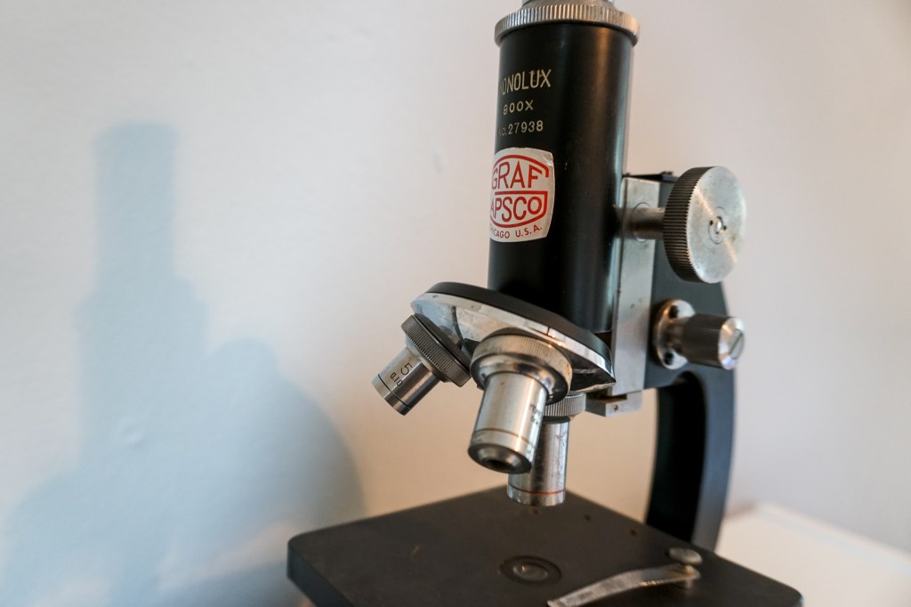 I looked around, hoping to find one to show her. Alas, knobs must truly be a thing of the past because I couldn’t find any. Until – aha! – I found an old microscope of Colin’s (he likes collecting old scientific equipment). I brought it over and pointed out the tuning knobs.